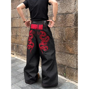 アメリカ式の大きいサイズの重工のデザイン感の赤蛇の刺繍のジーパンの子供のギャルの復古の亜文化の広い足のモップのズボン