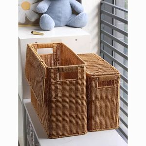 蓋付きバスケット、家庭用収納ボックス、ソファ収納ボックス、背の高い狭い角模造籐収納バスケット、隙間雑誌の壁の隅