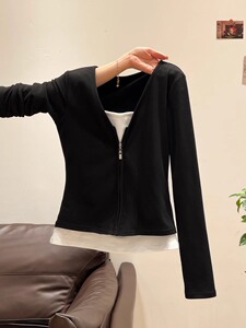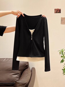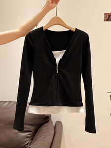 黑色拉链v领拼接假两件长袖T恤女春秋季高级感修身显瘦打底衫上衣