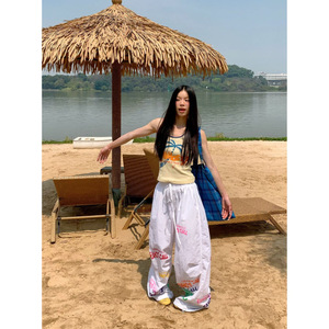 【原版复合面料】多巴胺字母印花蓝色伞兵裤女季宽松街舞爵士舞裤