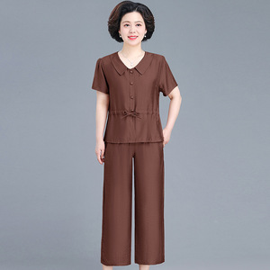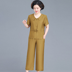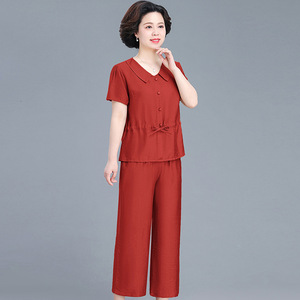 ファッショナブルな太ったママの夏のファッショナブルなツーピースパンツスーツ中高年女性の夏の半袖シャツワイドレッグパンツ上下セット