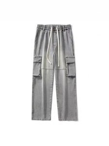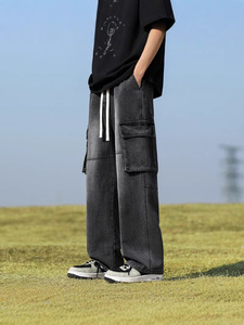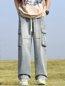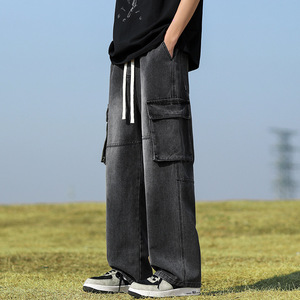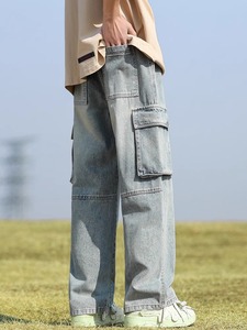 口袋工装牛仔裤男直筒宽松阔腿水洗复古美式高街裤子潮牌痞帅拼接