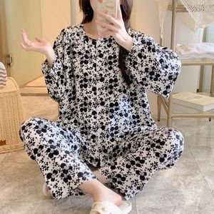 棉绸睡衣女春秋夏薄款宽松大码长袖长裤人造棉套装家居可外穿开衫