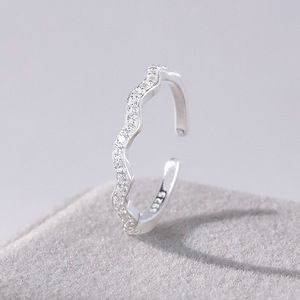 简约波浪镶钻戒指女S925纯银韩版小众冷淡风时尚指环开口素圈食指