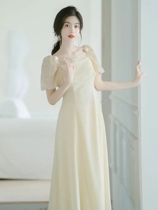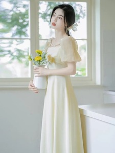 9071 フレンチウエスト痩身スクエアネックパフスリーブイエロードレスハイエンド妖精気質初恋ロングスカート夏