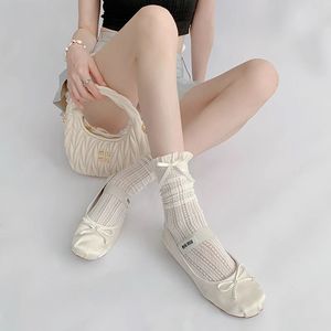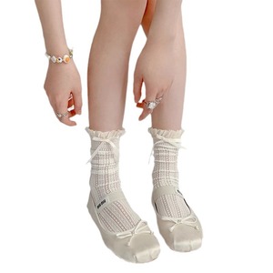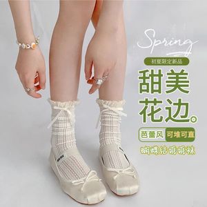 女性用蝶結びレースソックス、春夏ミッドカーフバレエスタイル薄い白いレースパイルソックス、Zhujiソックス