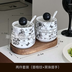 陶器調味料入れ【ダイヤ柄+黒ビーズ+木製トレー】2個セット
