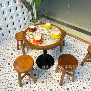 アメリカンバーケーキデザートショップダイニングテーブルと椅子カフェミルクティーショップ無垢材スレートレトロタイルテーブルと椅子の組み合わせ