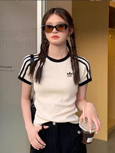 国境を越えたリブ生地のクローバー刺繍綿の丸首が痩せて見える半袖tシャツの上着の女性プルオーバー