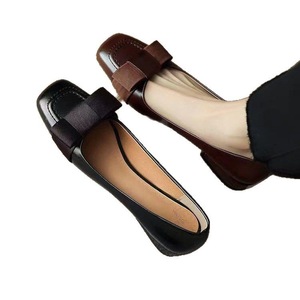 フランス式の小さい香りの風は色の小さい革靴の女性2025春の新型の方頭の太さと蝶結びの復古の中で靴と靴を合わせます。