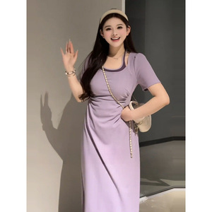 大码胖mm200斤连衣裙短袖女长款夏季遮肉收腰显瘦假两件