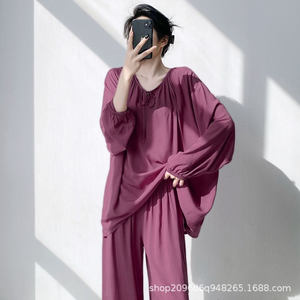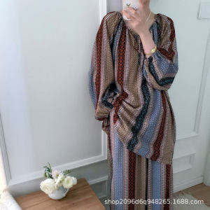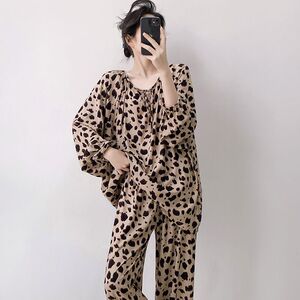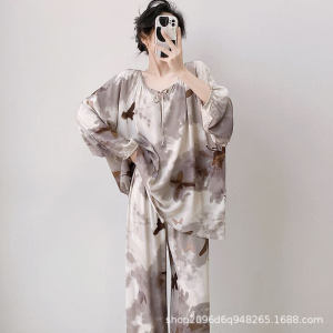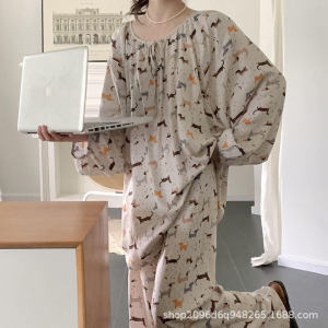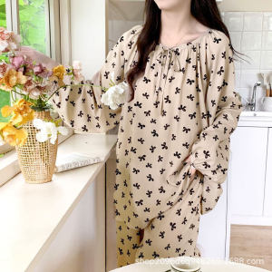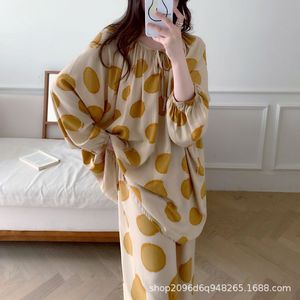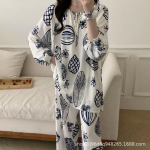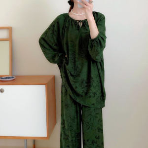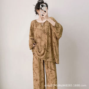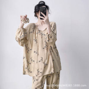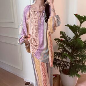 女性用パジャマ、春と秋の長袖人工綿シルク、国民風プリント、ゆったりとした大きいサイズの綿シルクホーム服セット、薄手