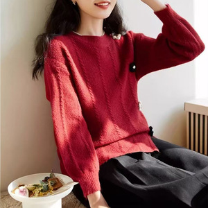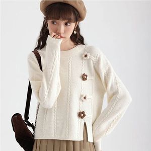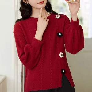 フレッシュデザイン立体新作フラワーセーターレディースショートスリット無地ボトムストップラウンドネック万能セーター