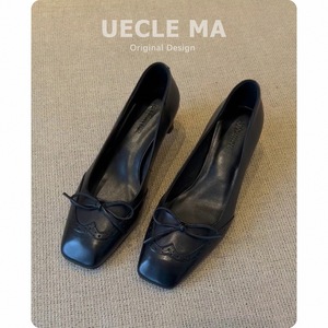 羊皮法式单鞋女方头黑色工作鞋粗跟蝴蝶结绝美不累脚真皮高跟鞋子
