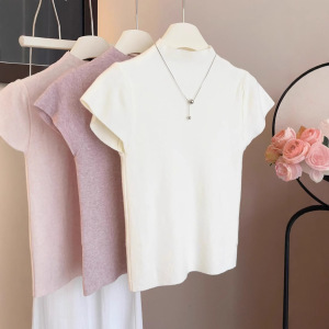 半高领黑色冰丝针织短袖T恤女夏季2025新款正肩紧身短款辣妹上衣