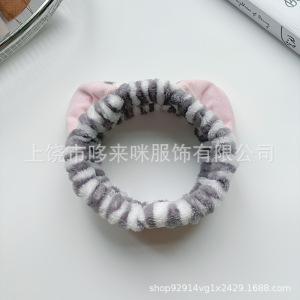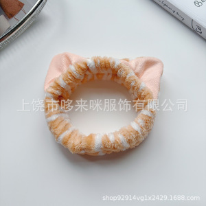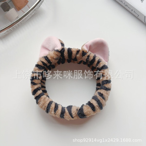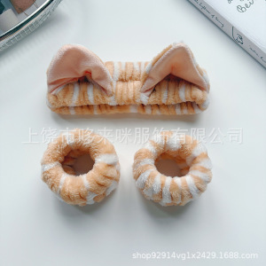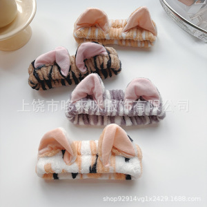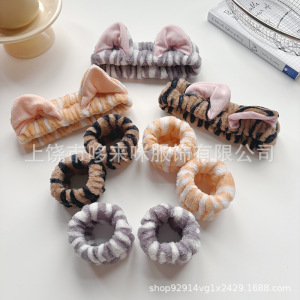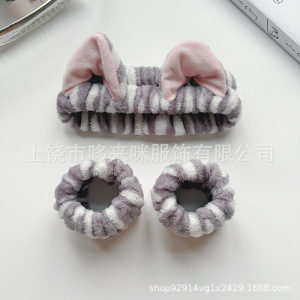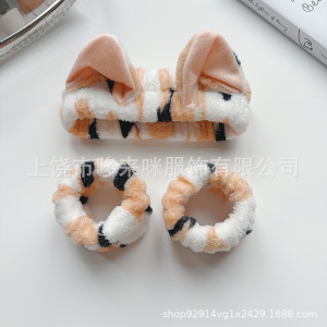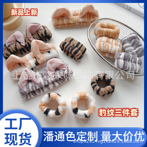 新しいぬいぐるみかわいいヒョウ柄猫耳カチューシャ女性の洗顔とメイクアップ防湿袖ストライプリストバンド 3 点セット