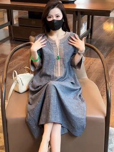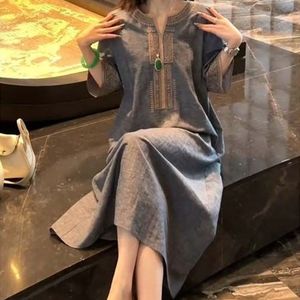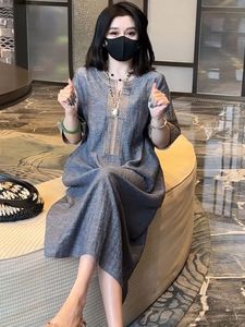 新中国風刺繍vネックワンピース女性2025夏の新型ゆるい痩せカジュアル気質長スカート