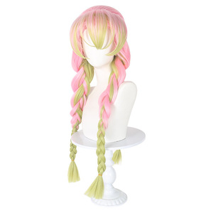甘露寺蜜璃コスプレウィッグ鬼滅の刃恋柱性転換cosガールピンクグリーングラデーションコーンウィスプ三つ編み