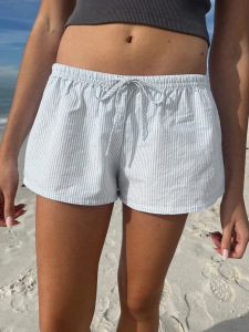 アメリカンリゾートスタイルのシンプルベーシックライトストライプ伸縮性レースアップカジュアルショーツ女の子用、ゆったりスリムで万能なホットパンツ
