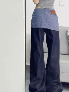 叠穿高腰显瘦阔腿拖地裤2025夏季美式复古假两件格纹绑带牛仔裤女