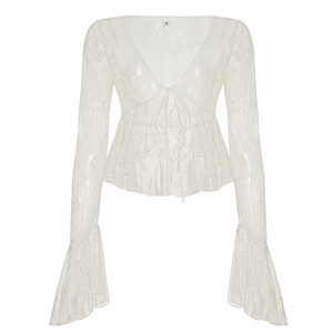 波西米亚度假不规则荷叶边罩衫上衣花瓣袖短款系带露脐长袖蕾丝衫