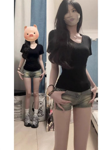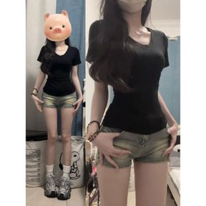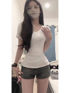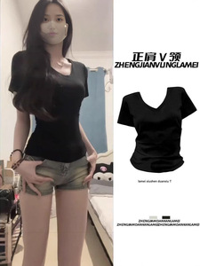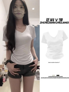 Pure Desire V ネックホワイトショルダーアイスシルク半袖 T シャツ女の子夏スリムウエストタイトホットガールシックトップ