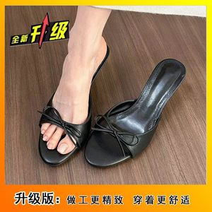 ニッチデザインスクエアトゥアウターオープントゥリボンハイヒールスリッパフレンチサンダルミュールハーフスリッパサンダル2025