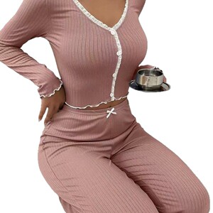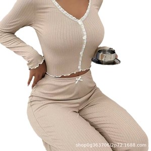 2025新型欧米家庭服アマゾンパジャマ長袖長ズボン修身レース双長家庭セット