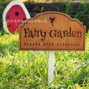 国境を越えた創造的な妖精の庭、歩き方を注意してください、木製の看板、妖精の庭の地面のプラグイン