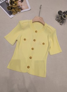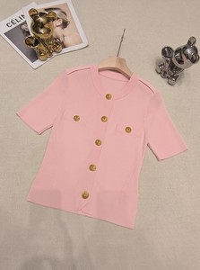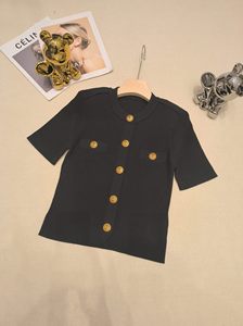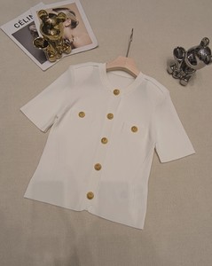 2025新款小香风气质名媛轻奢狮子头金扣弹力上衣圆领短袖针织开衫