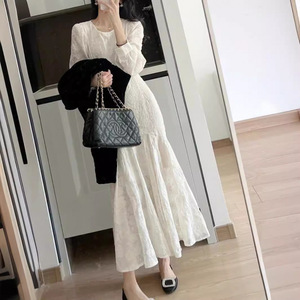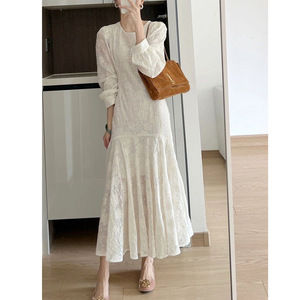 2025秋装新款名媛茶歇法式连衣裙子高级感白色雪纺刺绣鱼尾长裙女