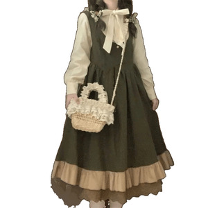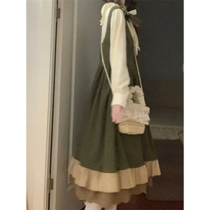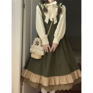 森系复古减龄两件套春秋新款设计感小清新绿色裙子叠穿蝴蝶结衬衣