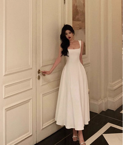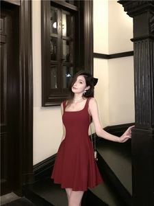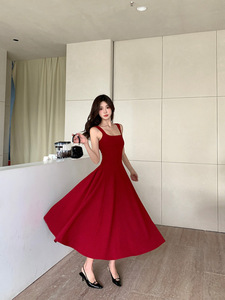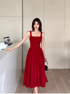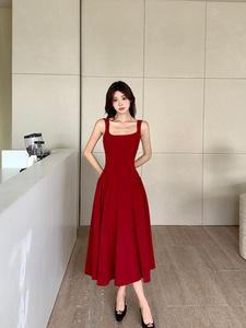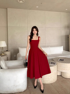 赤いミドル丈のシンプルな2025夏の新しいファッションハイエンドフレンチスタイルの小柄なサスペンダードレス
