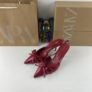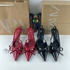ZAR 春の新作婦人靴赤黒リボンポインテッドトゥパテントレザーパンプスハイヒールスティレットファッションサンダル