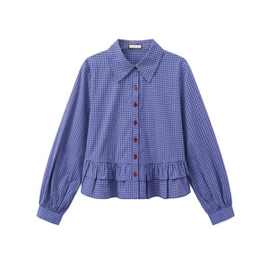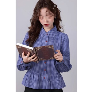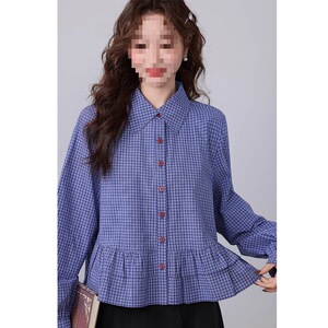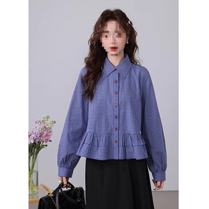 2025春季新款法式复古百搭短款长袖衬衣蓝色格子衬衫女polo领上衣