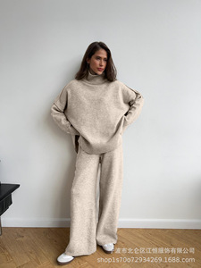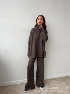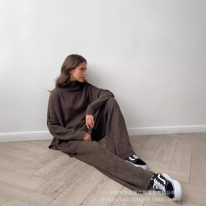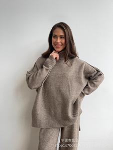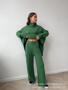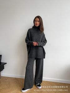 2024クロスボーダー高襟オープンウールセーターセット女性欧米ゆるいカジュアル怠惰なニットパンツ2点セット