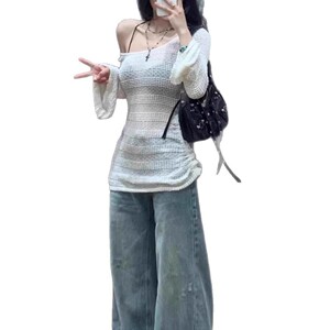 氷の糸の透かし彫りの薄いタイプの半袖のニットの女性2025夏の新型の洋風のフランスのカジュアルなゆったりした短い上着