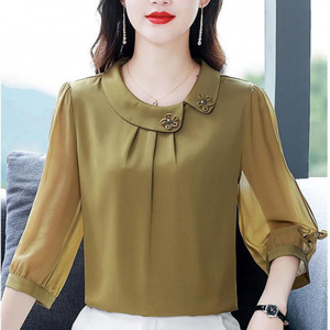 夏のおしゃれな中年ママ向け涼しい無地シャツ、七分袖シフォンシャツ、お腹カバーと年齢軽減に万能なトップス