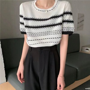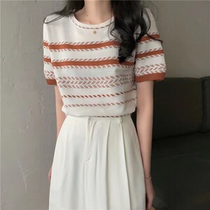 ストライプセーター女性のための 2024 夏デザインラウンドネック半袖コントラストカラー小柄なスリムフィットショートトップ