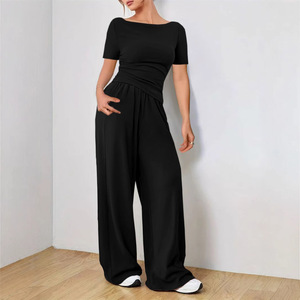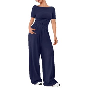 アマゾン2025国境を越えた対外貿易女性の春夏起爆金は純色半袖のリラックス感のある広脚ズボンセットを身に着けている