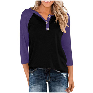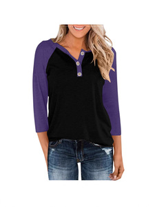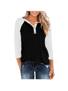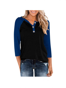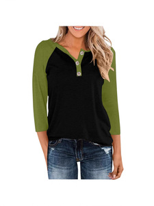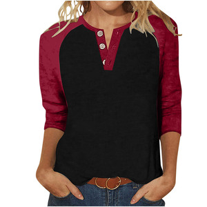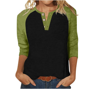 境外欧美跨境亚马逊爆款外贸女上衣欧美新款撞色V领插肩七分袖t恤