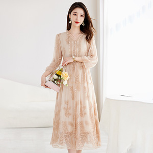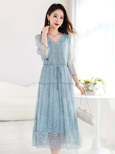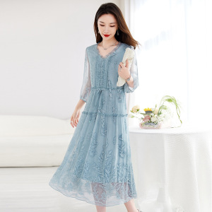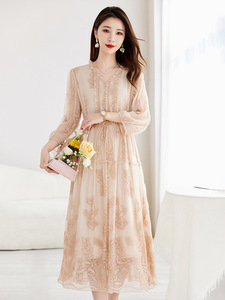 [Shunyu Embroidery] 夏 V ネック シルク ドレス レディース 大きいサイズ スリム マルベリー シルク ミドル丈スカート 9356