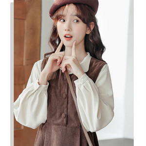ツーピース春カレッジスタイル甘いサスペンダードレス女子学生ウエスト痩身多用途ミドル丈ベストドレス