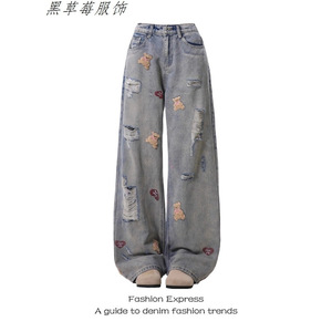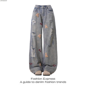 女性用ライトブルーベア刺繍ジーンズ春と秋の新しいアメリカンレトロホットガールリッピングローエッジデザインストレートパンツトレンディ