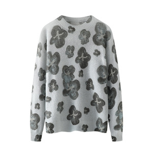 高版本现货春季新款宽松显瘦花朵提花圆领马海毛套头针织衫女毛衣