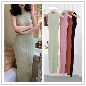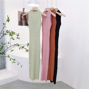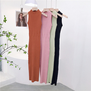 7384 フレンチレトロハーフタートルネックノースリーブショルダーウエスト痩身スリットドレスベストドレスインナーロングスカート女性用