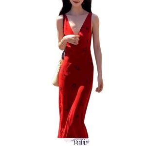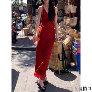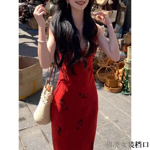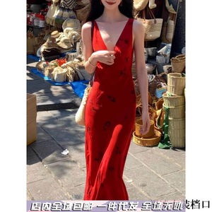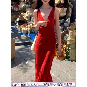 复古气质红色吊带连衣裙女夏季v领印花裙子修身收腰包臀鱼尾长裙