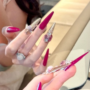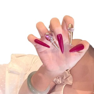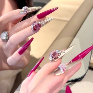 純粋な手作りのネイルは甲の富家の千金感のバラの赤い魔鏡の粉を着て爆発してばらばらになってダイヤモンドの長い金のネイルを現します。