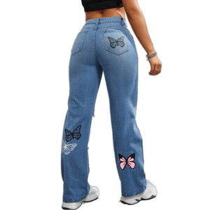 设计感破洞蝴蝶印花牛仔裤女直筒高腰美式个性街头潮流牛仔裤2025