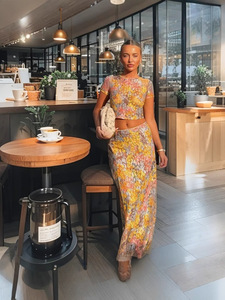 アマゾンの夏の婦人服は国境を越えて欧米の風景の油絵のプリントシリーズの半袖の臍のプリントの上着の半身のスカートを越えます。